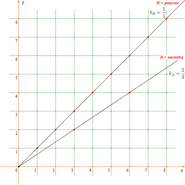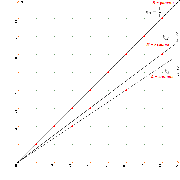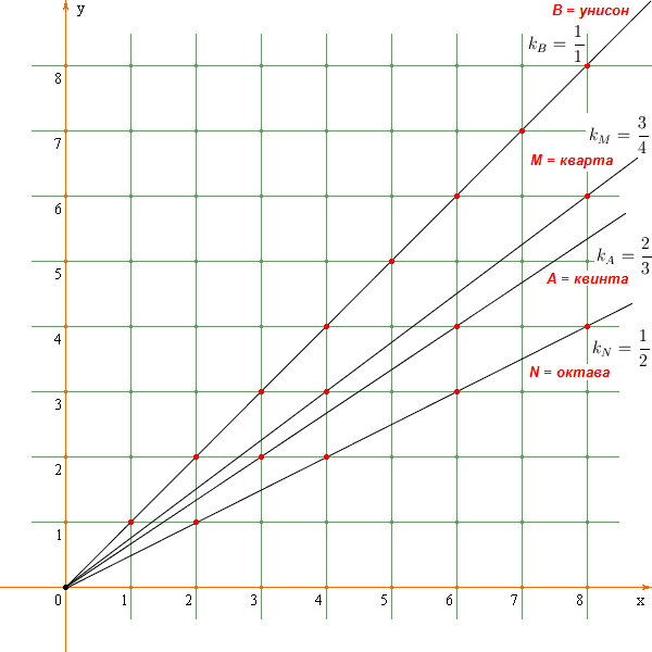 повышающих и понижающих музыкальных интервалов, представленных лучами, в зависимости от величины углового коэффициента лучей, см.