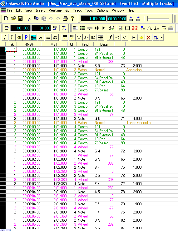 После открытия этого файла в музыкальном редакторе Cakewalk Pro Audio 9.00 мы видим, что он содержит