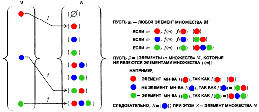 Например, S содержит только голубой кружок. Ввиду того что S является подмножеством множества М, и так как по предположению f определяет взаимно однозначное соответствие, должен существовать некоторый элемент a из M, которому соответствует S, или, другими словами, для которого f(a) совпадает с S.